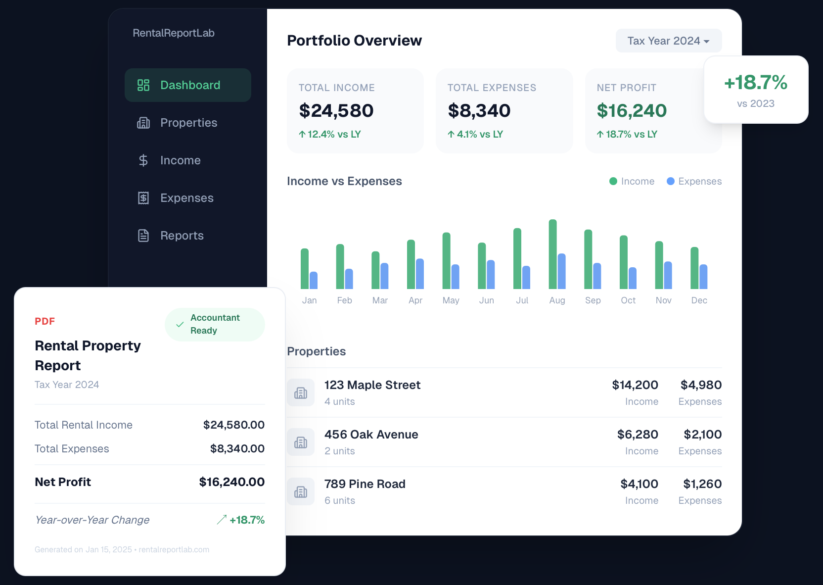 Track income and expenses across all your rental properties. Compare year-over-year performance and generate accountant-ready PDF reports in seconds.